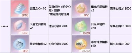 3、其他材料:根据心得等级解锁采集、清洁、钓鱼、捕虫等任务获取。
