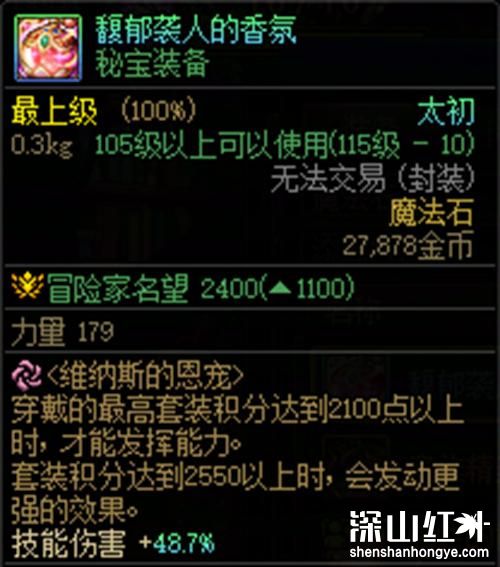 2、馥郁袭人香气是一款来自维纳斯美神军团的秘宝右槽装备,品级达到太初,名望值高达1400点。