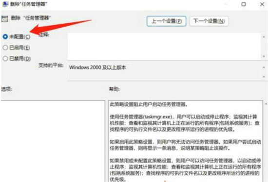 win11任务管理器被管理员禁用了怎么打开?有些win11用户想要打开任务管理器去管理自己的系统程序,但是却遇到了任务管理器被管理员禁用的情况,其实大家可以通过gpedit.msc命令快速打开组策略编辑器,然后通过Ctrl+Alt+Del调出删除任务管理器面板,在其中将未配置勾选之后就能顺利打开任务管理器了。