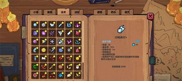 这套流派的核心是法术书和疾行,同时搭配追踪、时长和增伤三个buff。利用疾行的无敌效果来强化法术书,再通过时长增加2秒无敌效果,这样可以顺利度过法术书的冷却期,从而完成无限连击全屏追踪的攻击效果。适合新手玩家尝试,操作难度较低但效果显著。