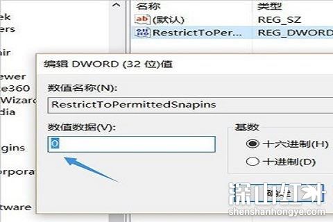 2、在编辑器左侧依次找到HKEY_CURRENT_USER\Software\Policies\Microsoft\MMC,然后将RestrictToPermittedSnapins的值设置为0