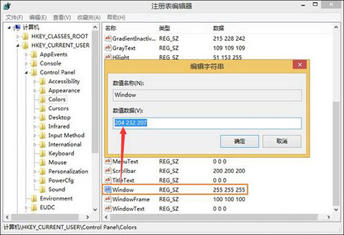 3、最后点击“window”,右击鼠标选择“修改”,将其值改为204 232 207,重启系统就可以了。