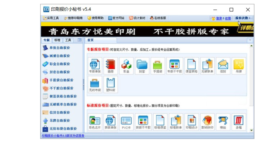 印刷报价小秘书软件是一款安全稳定、快捷方便的印刷报价软件。印刷报价小秘书软件包括彩页自动报价、画册自动报价、名片自动报价、彩盒自动报价、封套自动报价、手挽袋自动报价、不干胶自动报价、吊牌自动报价等。软件无论是专版印刷,还是拼版印刷,印刷报价小秘书一样能精确地计算出你的价格,误差极小,有了它,为客户印刷报价从此就这么简单。